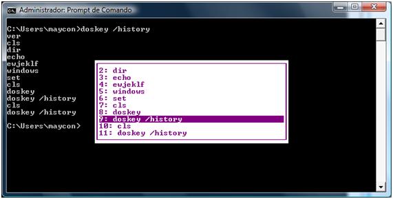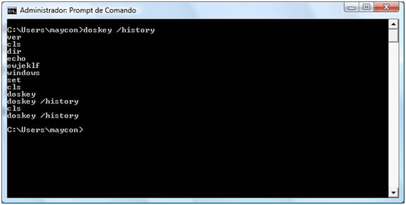 No sistema linux temos o comando history que traz um histórico os comandos digitados no shell, no Windows também temos um comando que traz o histórico dos comandos digitados na respectiva sessão, o comando é o doskey, para verificar os comandos digitados no prompt de comandos é só usar o doskey /history que vai mostrar os comandos armazenados na memória da sessão, como pode ser observado no print abaixo: