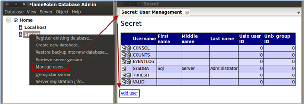 Use the instructions above in the “Retrieve Remote Server Version” section in order to register the remote server if you have not done so already. Then right-click on the server that you just registered, select "Manage Users" and enter the SYSDBA credentials if they are not saved from the remote version enumeration above.